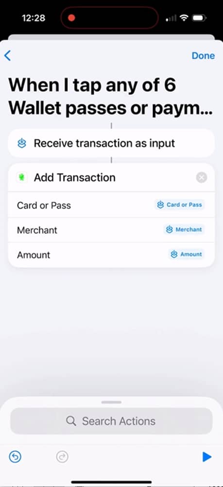 Open Shortcut with Open Card action and receive transaction from Apple Wallet